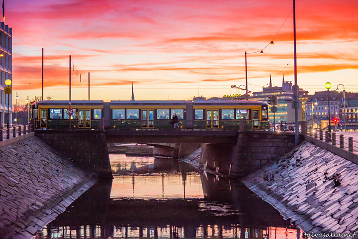 Helsinki: A new Artic tram on the old bridge crossing the canal between the districts of Katajanokka and Kruununhaka. By 2018 there will be a total of 40 new trams in traffic.