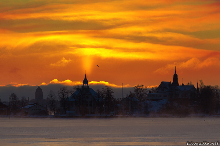 Helsinki: A cold winter morning's view over the South Harbour towards the islands of Valkosaari, Luoto and Suomenlinna. Picture taken from the shore of the Market Square soon after sunrise.