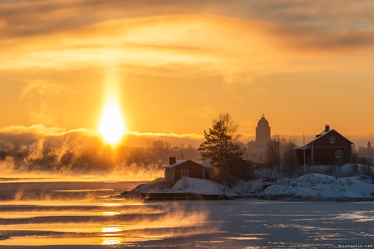 Helsinki: The sun rises above the islands of Suomenlinna in a view over the South Harbour on a cold winter morning. In the front is the small island of Ryssänsaari, surrounded by sea smoke.