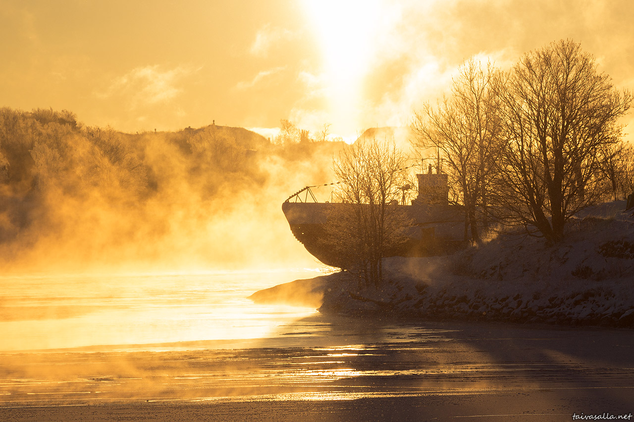 Helsinki: Submarine Vesikko guarding the frozen bay of Tykistölahti, surrounded by sea smoke. View from the Suomenlinna islands on a very cold winter morning.