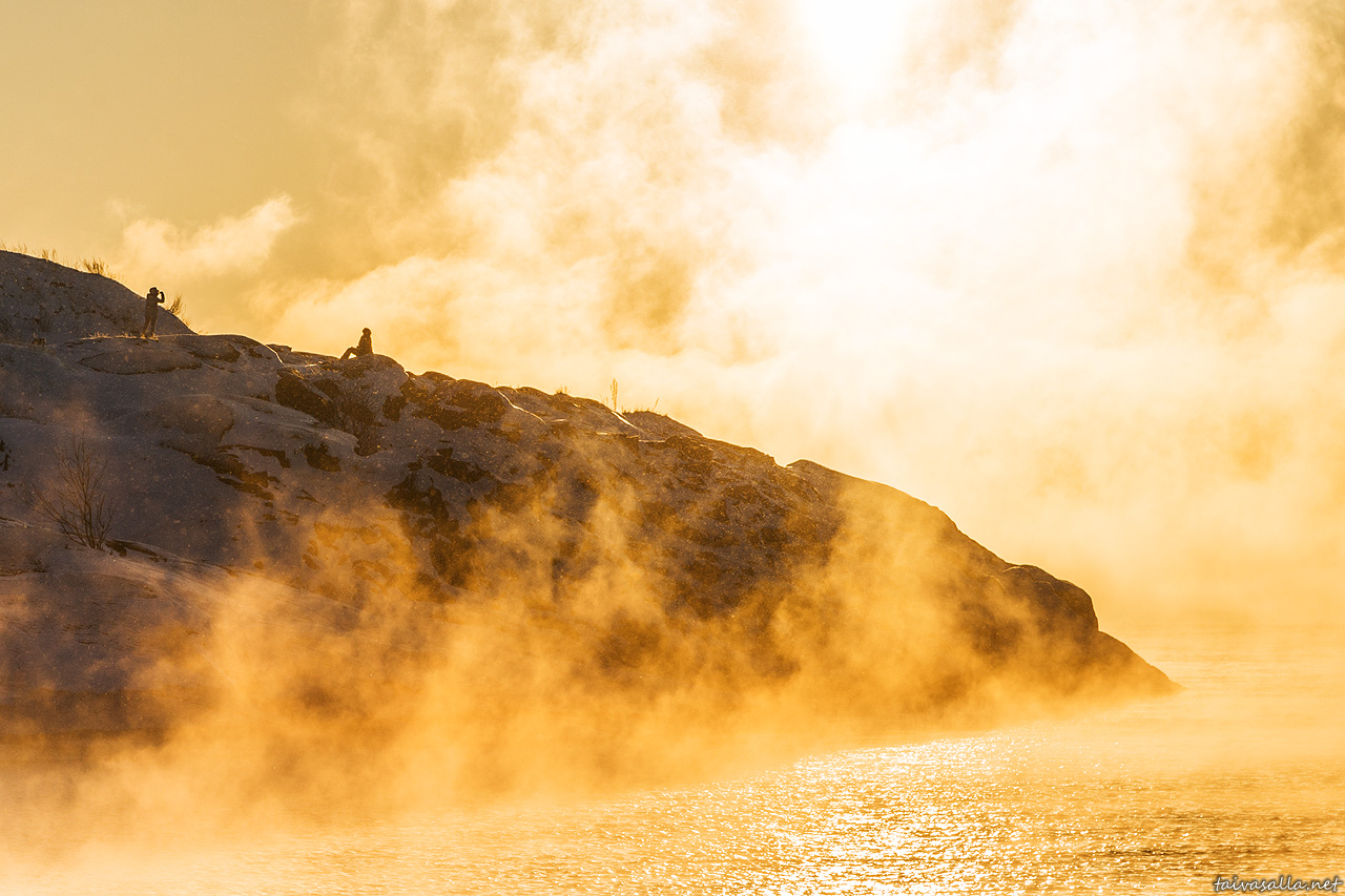 Helsinki: Merisavu ympäröi Kustaanmiekan saarta Suomenlinnassa kylmänä talviaamuna.