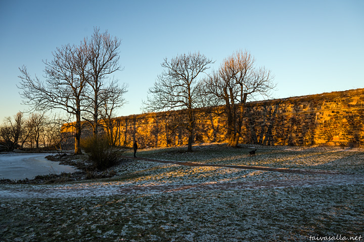 Helsinki: A man walking his dog in Piper's Park close to the Love Pond on Susisaari, one of the Suomenlinna islands, on a chilly winter morning.