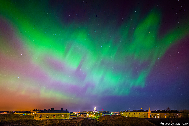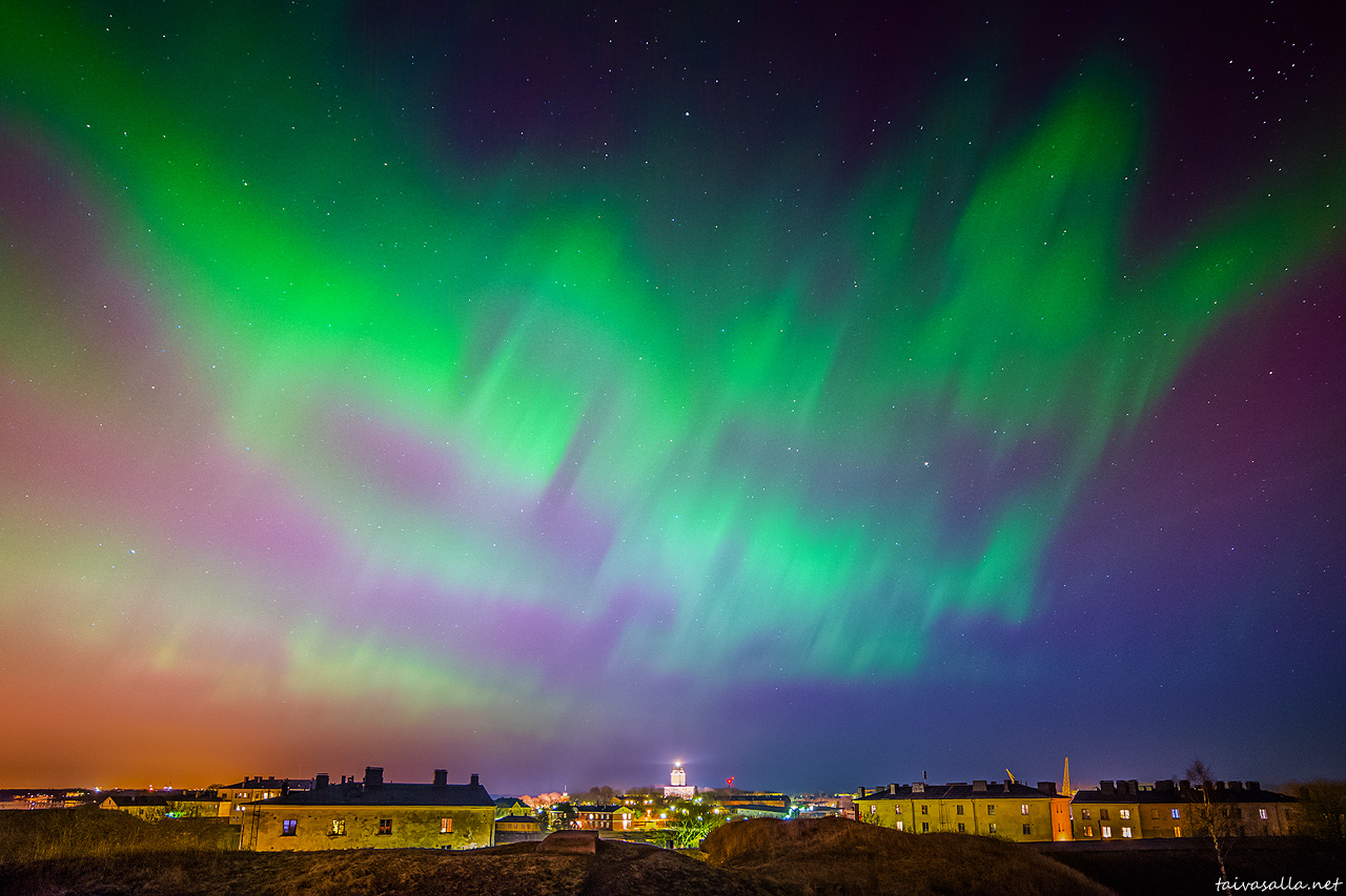 Helsinki: Aurora Borealis, also known as the Northern Lights, glowing in the eastern sky above the islands of Suomenlinna. View from Länsi-Mustasaari island towards Suomenlinna lighthouse, which is located on Iso Mustasaari island.