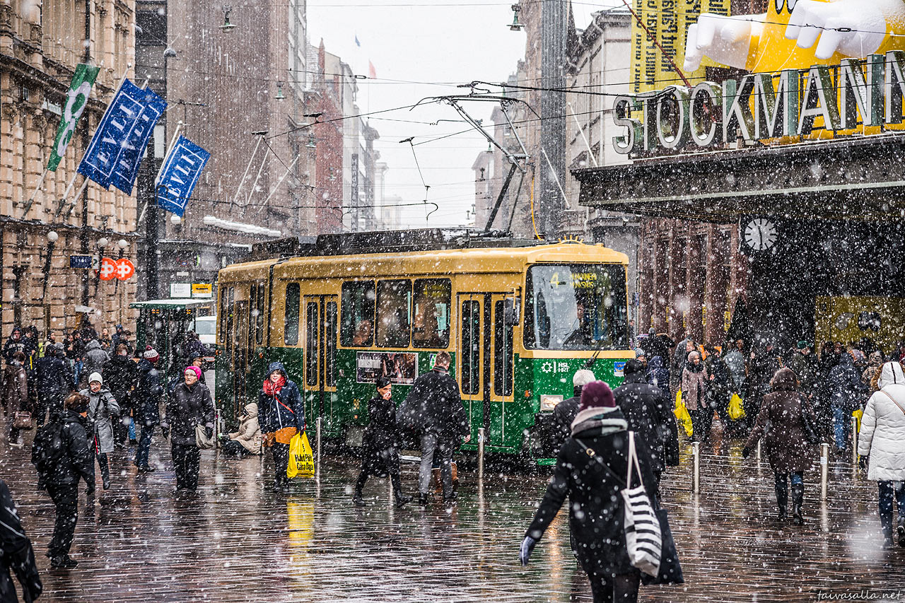 Helsinki: A snowy spring day's view along Aleksanterinkatu street from the statue of The Three Smiths in the city centre.