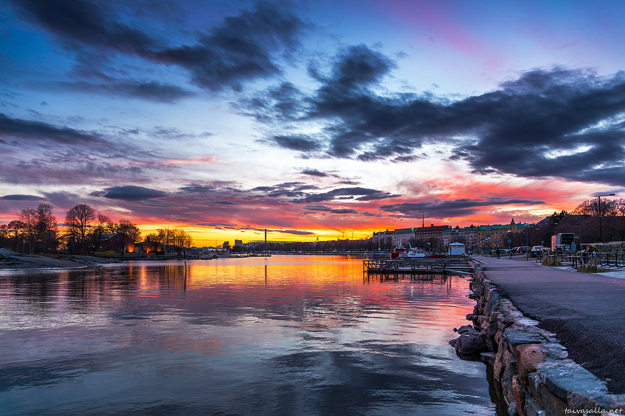 Helsinki: Sunset view from the shore of Kaivopuisto district on a beautiful spring evening. On the left is the northern Uunisaari island, and in the background is the district of Ullanlinna.