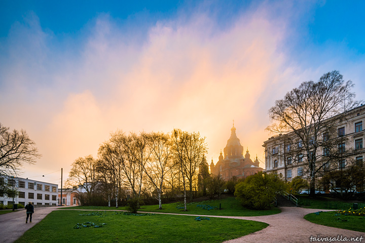 Helsinki: Fog drifting in over the city from the sea at sunset, dimming the Uspenski Cathedral. View from the newly renamed Tove Jansson Park located in the district of Katajanokka.