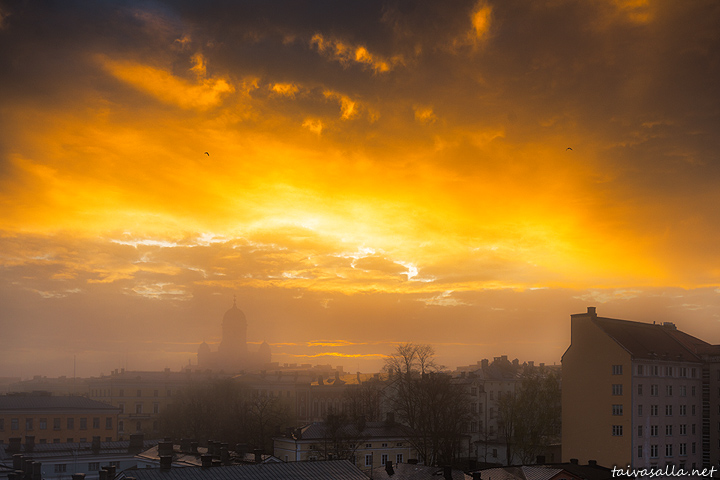 Helsinki: Sunset above the district of Kruununhaka with Helsinki Cathedral dimmed by fog drifting in from the sea. Photo taken near the Uspenki Cathedral, located in the district of Katajanokka.