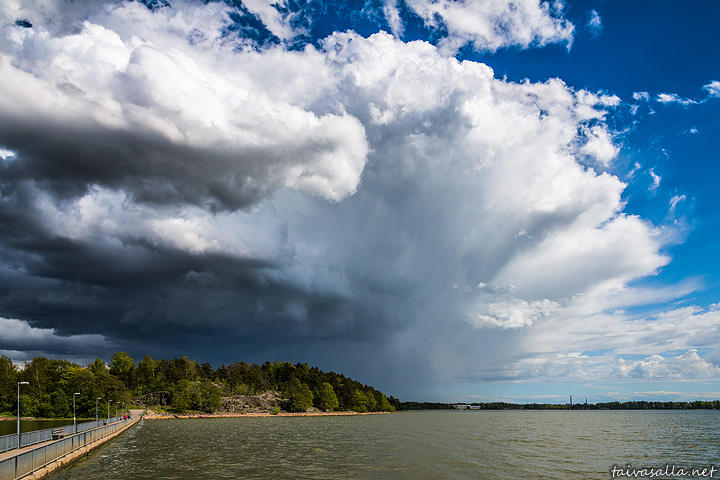 Helsinki: View from the northern shore of Laajalahti bay on a spring day dominated by rain showers. Photo taken towards the district of Munkkiniemi from the small island of Tarvo.