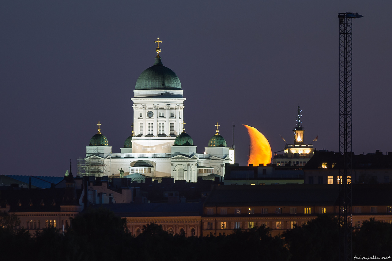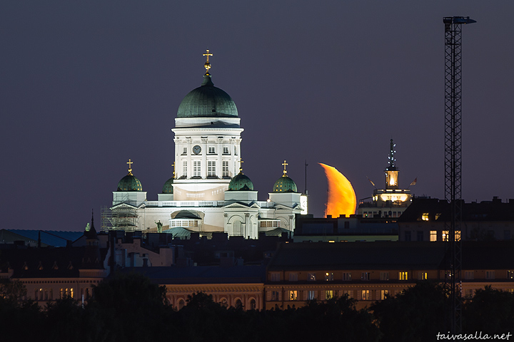 Helsinki: The moon sets behind the roofs of Kruununhaka district, next to Helsinki Cathedral. Photo taken from Mustikkamaa island in the evening twilight.