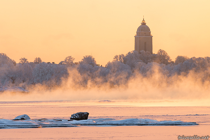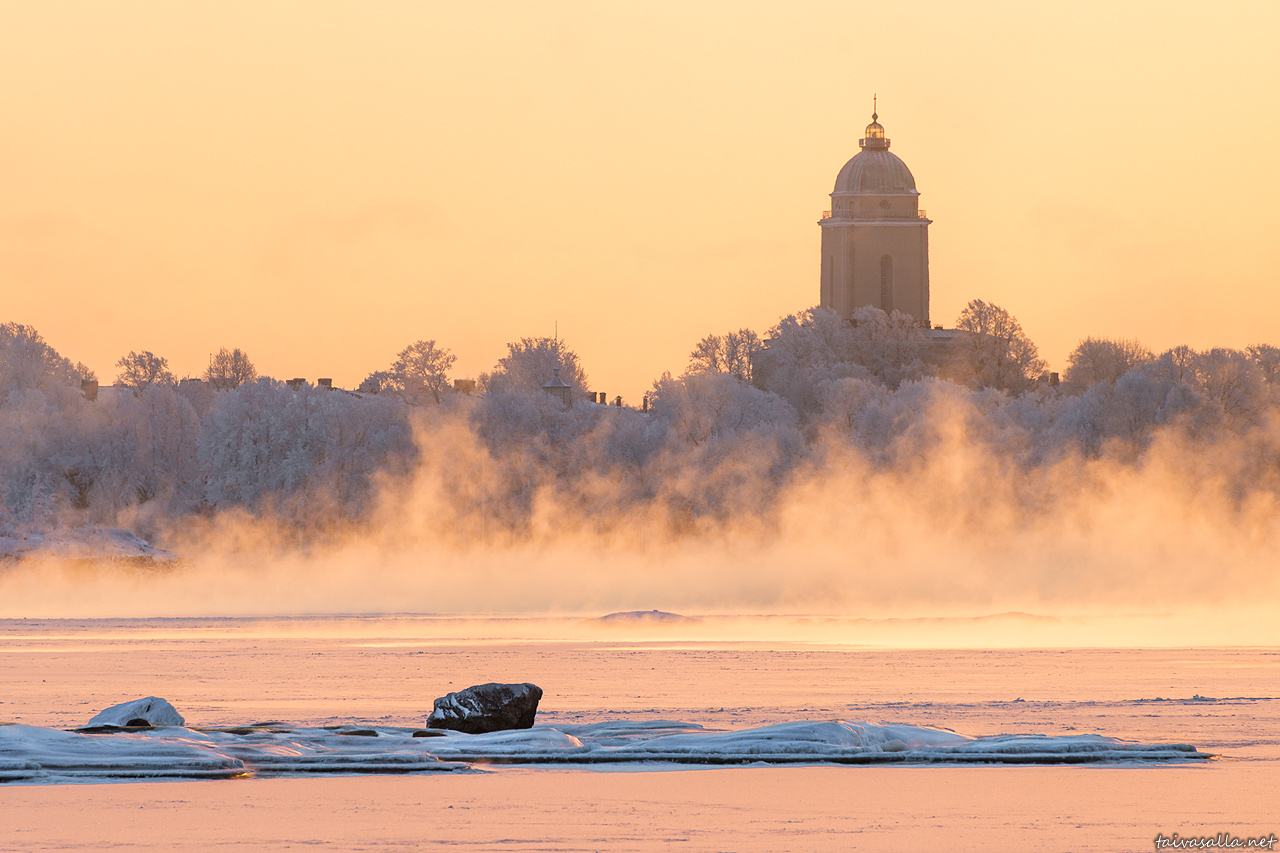 Helsinki: Sea smoke in front of Suomenlinna lighthouse on a cold winter morning. The combined church and lighthouse is located on Iso Mustasaari, the largest of the Suomenlinna islands. Photo taken from the shore along Ehrenströmintie street in the district of Kaivopuisto.