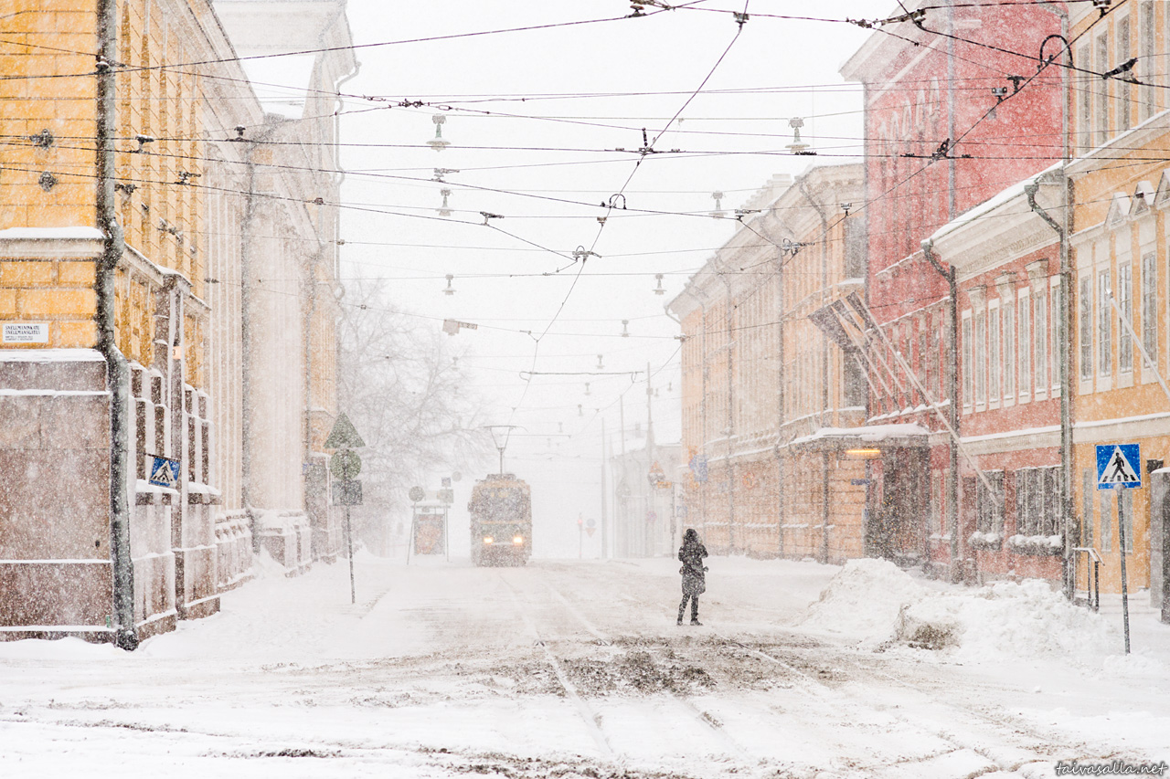 Helsinki: Dense snowfall on Aleksanterinkatu street seen from the corner of the Senate Square.