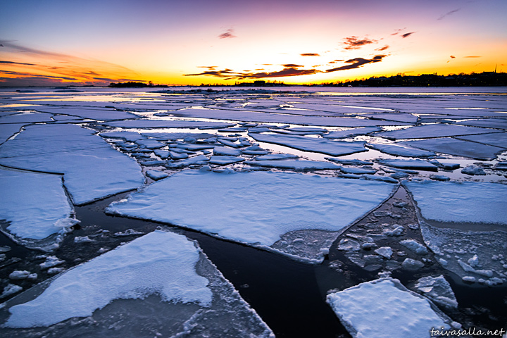 Helsinki: Ice floes seen from the Suomenlinna ferry in the evening twilight.