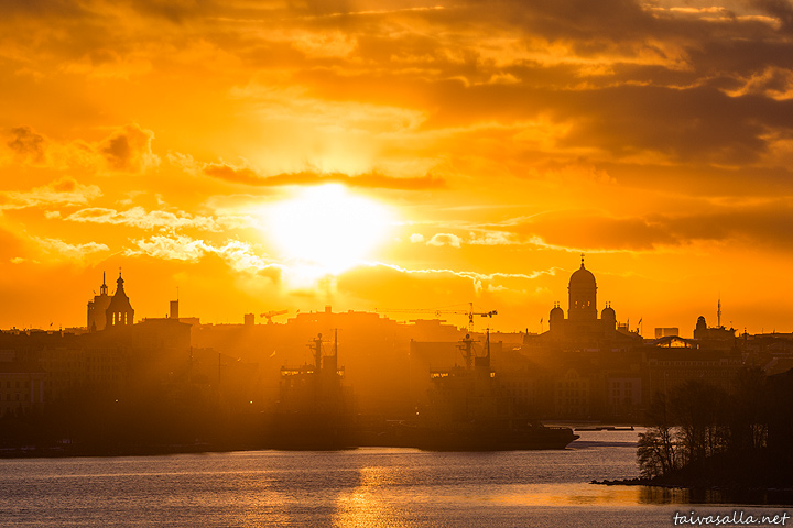 Helsinki: Sunset above the North Harbour and the districts of Katajanokka and Kruununhaka. Photo taken from atop Kruunuvuori hill, located on the western shore of Laajasalo district.