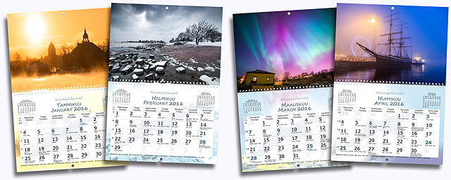 Vuoden 2016 seinäkalenteri taivasalla.net -sivuston kuvilla