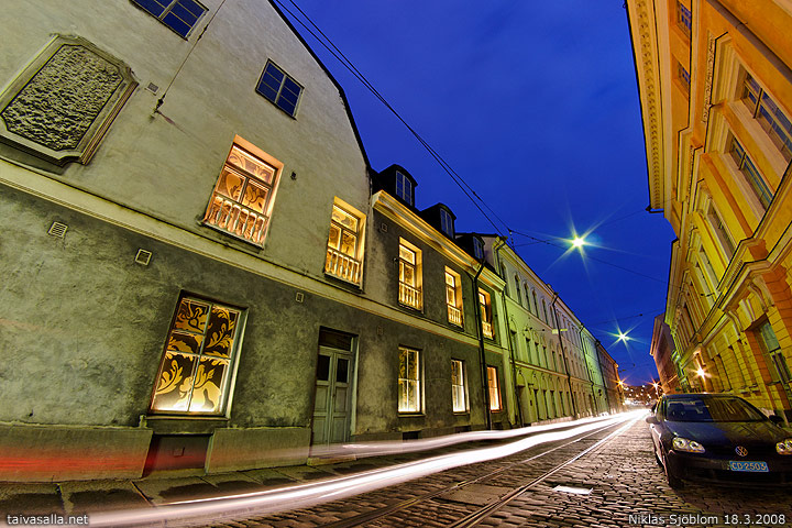 Helsinki: Evening view along Katariinankatu street from the corner of Aleksanterinkatu street towards the Market Square and the South Harbour. On the left is the oldest building of the city, the Sederholm house, built in 1757.